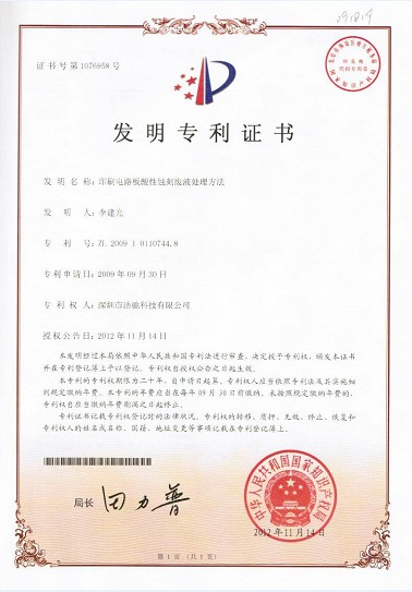 稳定剂及配置方法(专利号为:ZL 2010 1 0296599.X )、印刷电路板酸性