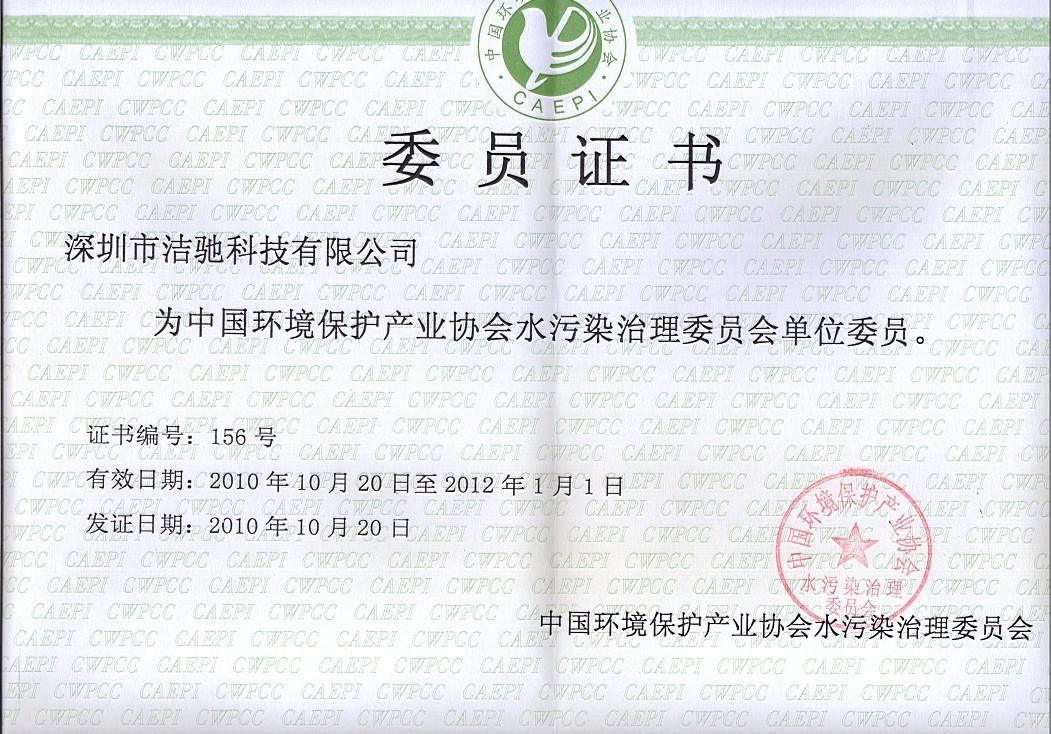 2010年10月20日,我司荣获《中国环境保护产业协会水污染治理委员会委员证书》。此次新批准的单位委员有5家企业,我司为其中一家。以下是委员证书扫描件