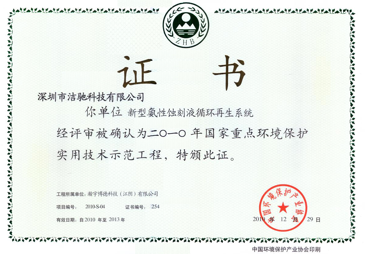 我司新型氨性蚀刻液循环再生系统获2010国家重点实用技术示范工程
