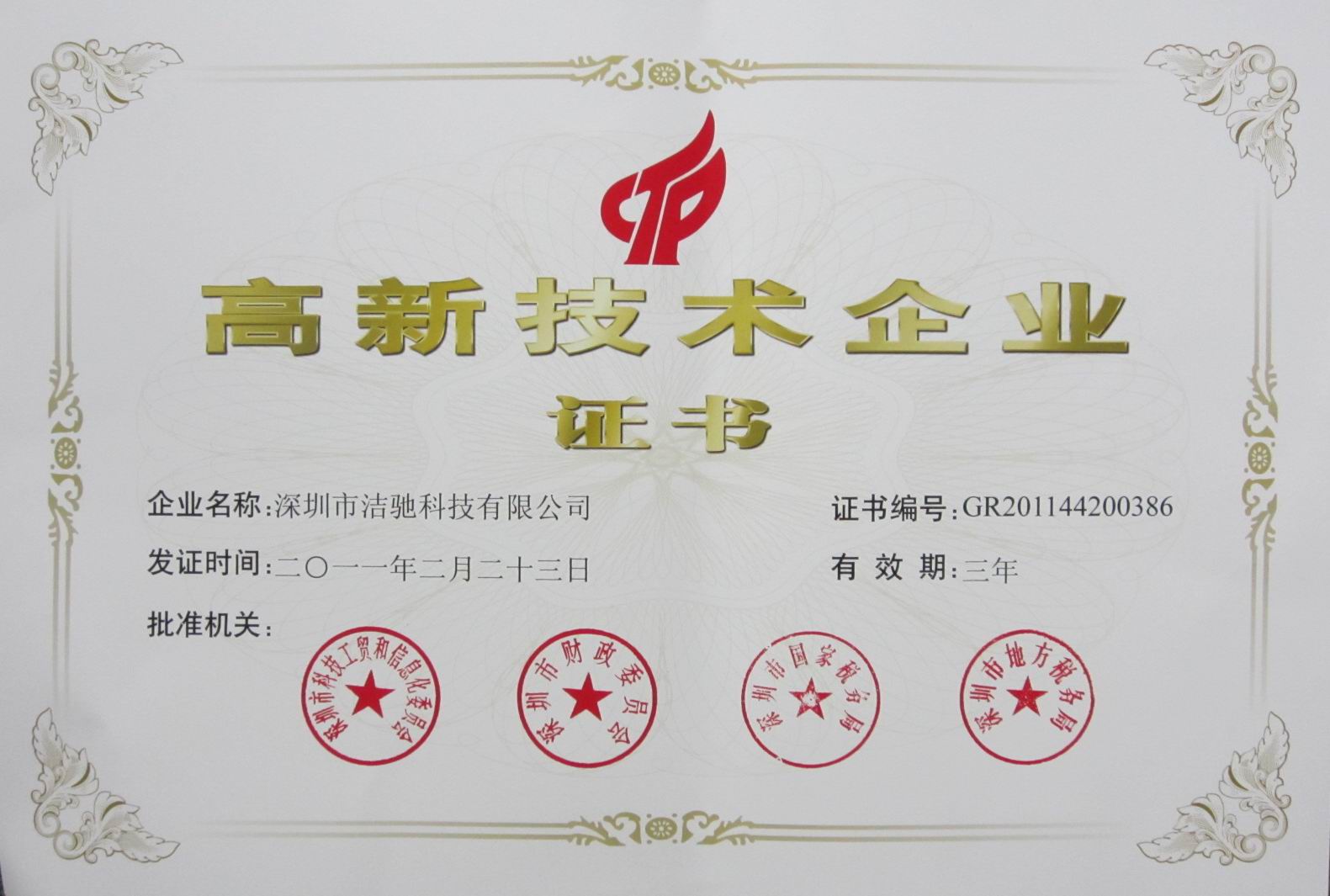 根据《高新技术企业认定管理办法》(国科发火〔2008〕172号)和《高新技术企业认定管理工作指引》(国科发火〔2008〕362号)的有关规定,我市2011年第一批共有403家企业通过国家高新技术企业认定。洁驰科技上报的国家高新技术企业材料于2011年2月23日通过审核认定,并在深圳市科技工贸和信息化委员会网上进行公示,2012年3月5日获取国家高新技术企业证书。