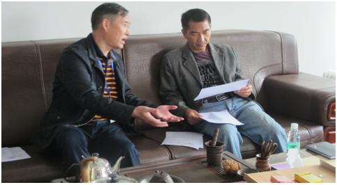 ▲党支部筹备工作负责人向胡忠军(右)汇报工作