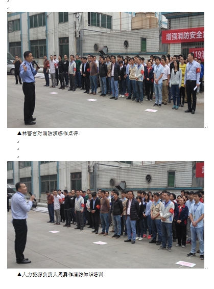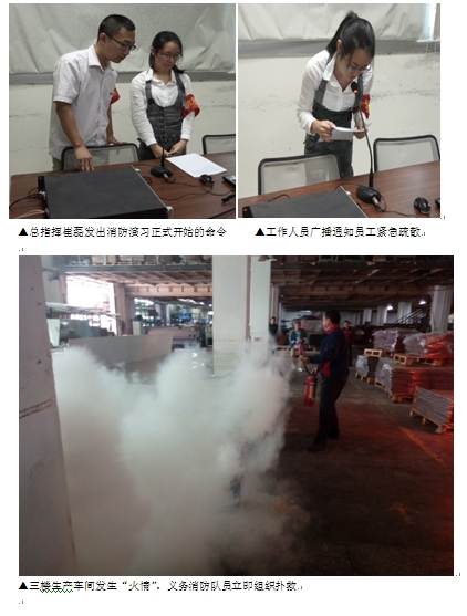 “火源”是因三楼生产车电线老化起火。火情发生后,义务消防队员立即提起灭火器冲向浓烟滚滚的着火现场,开始了扑救工作。在义务消防队员的奋勇努力下,火势很快被扑灭。员工们迅速向集合地点疏散。与此同时,救护组、警戒组、疏散组、消防组等各就各位,迅速行动。